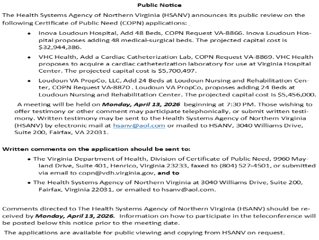 Note: Application materials for a Certificate of Need are obtained through the Virginia’s state DCOPN program office and can be downloaded from the state website. Applications for proposed facilities and/or services in Health Planning Region II/Planning District 8 are submitted to both the state offices and to the HSANV offices.